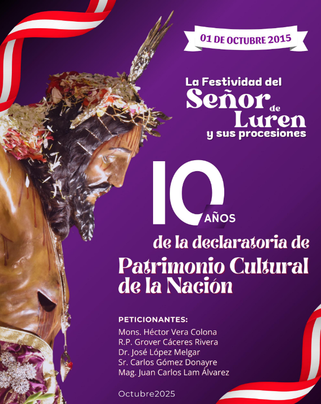 Hoy, 1 de octubre, se cumplen 10 años desde que el Ministerio de Cultura declaró Patrimonio Cultural de la Nación a la Festividad del Señor de Luren y sus procesiones. Esta declaratoria, establecida mediante la Resolución Viceministerial N° 145-2015-VMPCIC-MC y publicada en el diario oficial El Peruano, reconoce a esta tradición como una expresión religiosa de gran riqueza simbólica, cuyo culto y devoción, transmitidos de generación en generación, son un eje de articulación social y un referente de identidad para la población de Ica y el Perú.
