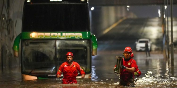 Las fuertes lluvias que se registraron en Arequipa dejaron un saldo de viviendas inundadas y un notable impacto en la infraestructura vial de la ciudad. El zanjón de la variante de Uchumayo, donde el agua alcanzó hasta 1.60 metros, se convirtió en un punto crítico cuando un bus con 47 pasajeros quedó atrapado. Afortunadamente, los rescatistas actuaron rápidamente, utilizando balsas para evacuar a los ocupantes del bus que se había convertido en una “laguna” improvisada.