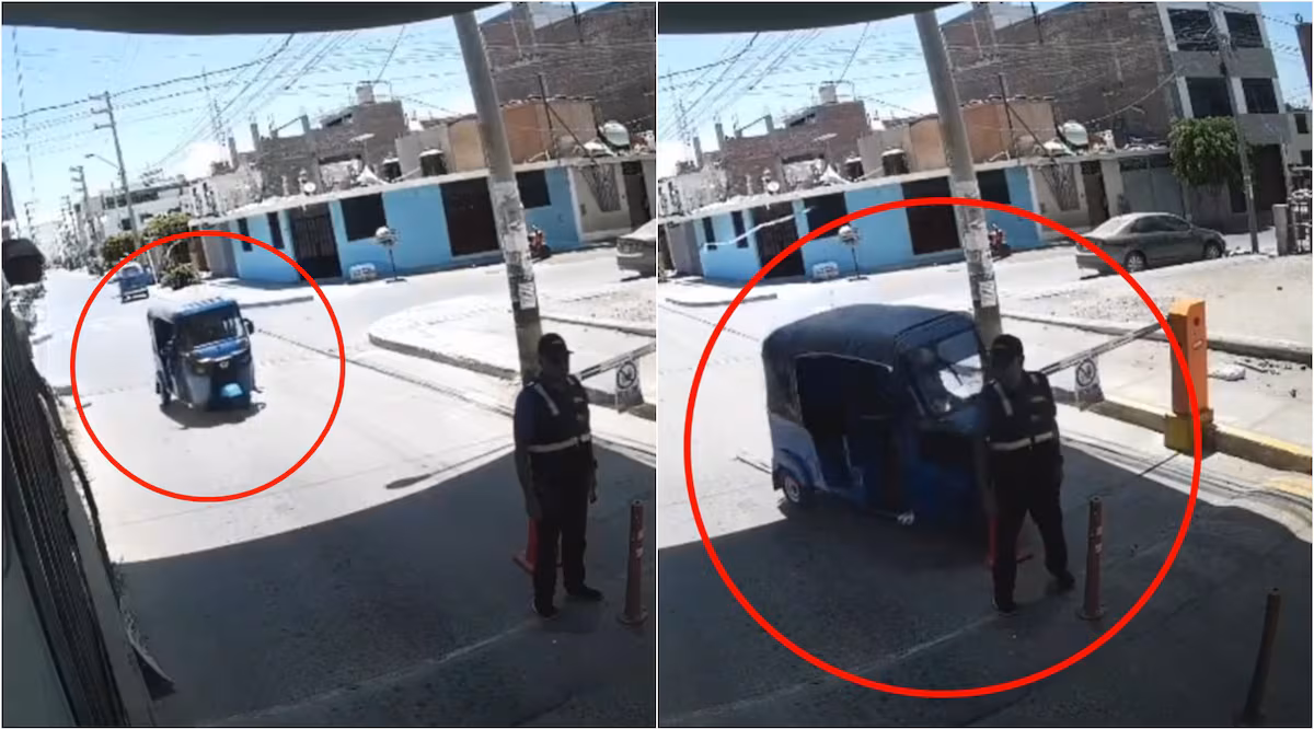 El hecho, registrado aproximadamente a las 11:11 a.m. por el circuito cerrado de cámaras de seguridad de la zona, captó el momento preciso de la agresión. Las imágenes son elocuentes: el vigilante se encontraba de pie, realizando sus labores, cuando una mototaxi que circulaba a velocidad considerable lo impactó de manera sorpresiva y violenta por la espalda. El conductor no realizó maniobra alguna para frenar o esquivar a la víctima.