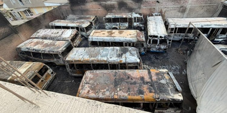Un incendio en una cochera de la zona de Villas de Oquendo, Callao, dejó 12 vehículos de transporte público inutilizables. La policía investiga si el fuego fue provocado por delincuentes que exigen pagos a los choferes. La emergencia requirió hasta diez unidades de los bomberos, que debieron ingresar por casas cercanas para apagar las llamas. Los transportistas, afectados económicamente, mostraron su preocupación ante esta situación alarmante, que refleja un posible vínculo entre la extorsión y el incremento de la delincuencia en la zona. #Callao #Incendio #Extorsión #TransportePúblico #SeguridadCiudadana