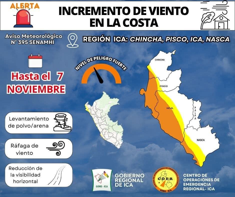 La Gerencia Regional de Gestión Regional de Desastres, a través del Centro de Operaciones de Emergencia Regional, informa que, según Aviso Meteorológico N ° 395 del SENAMHI , desde el martes 4 al viernes 7 de noviembre, se presentará el incremento de la velocidad del viento en la costa, de moderada a fuerte intensidad. Este fenómeno podría generar levantamiento de polvo y arena, así como la reducción de la visibilidad horizontal.